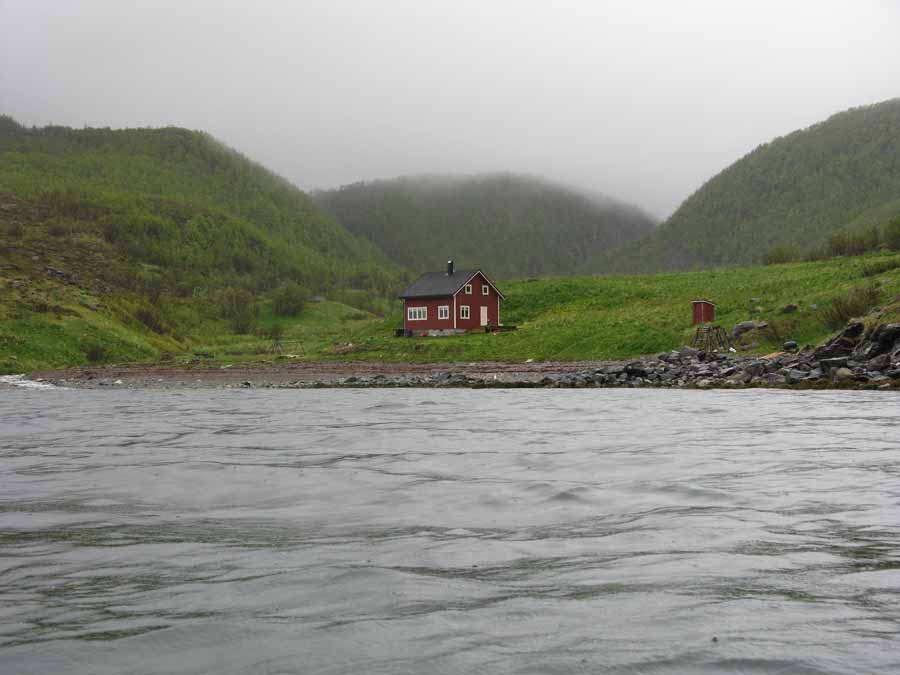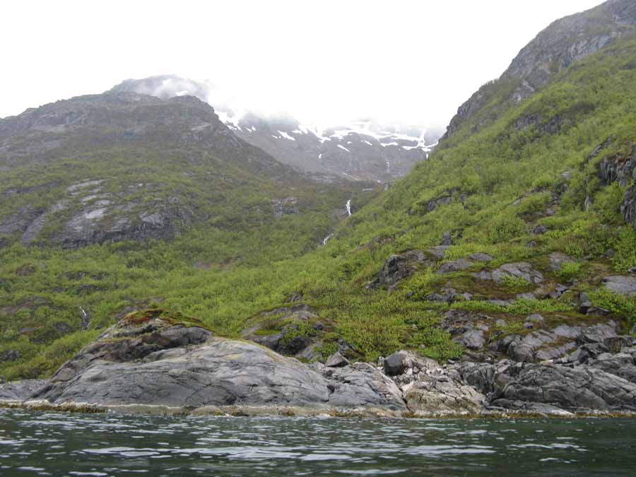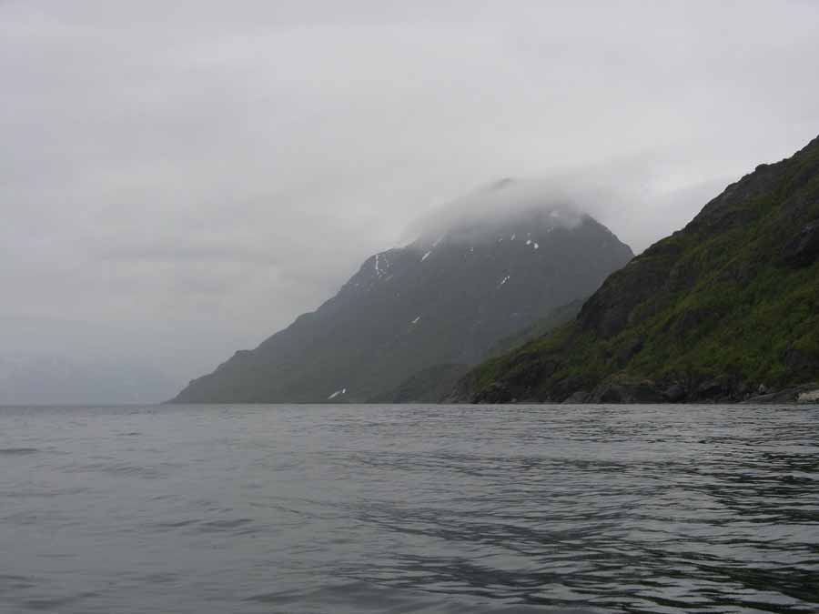 With the drizzle now turning to heavy rain I paddled up the south coast of Stjernoya for an hour passing a steep coastline which continued up birch and juniper clad hillsides to the bare rock and snowfields of craggy peaks above. Most of these peaks were hidden in the mist as they went up to nearly 1000 metres.