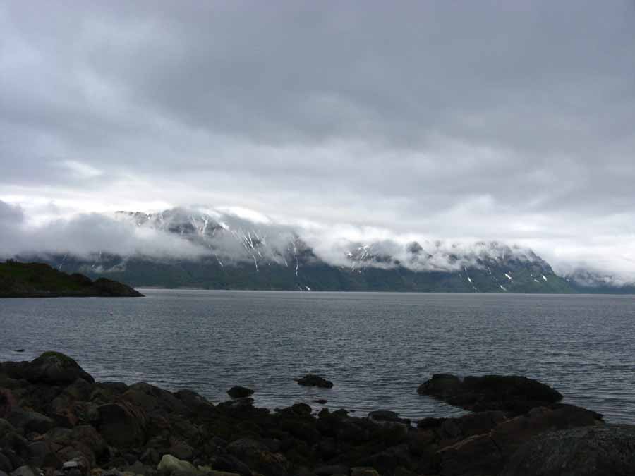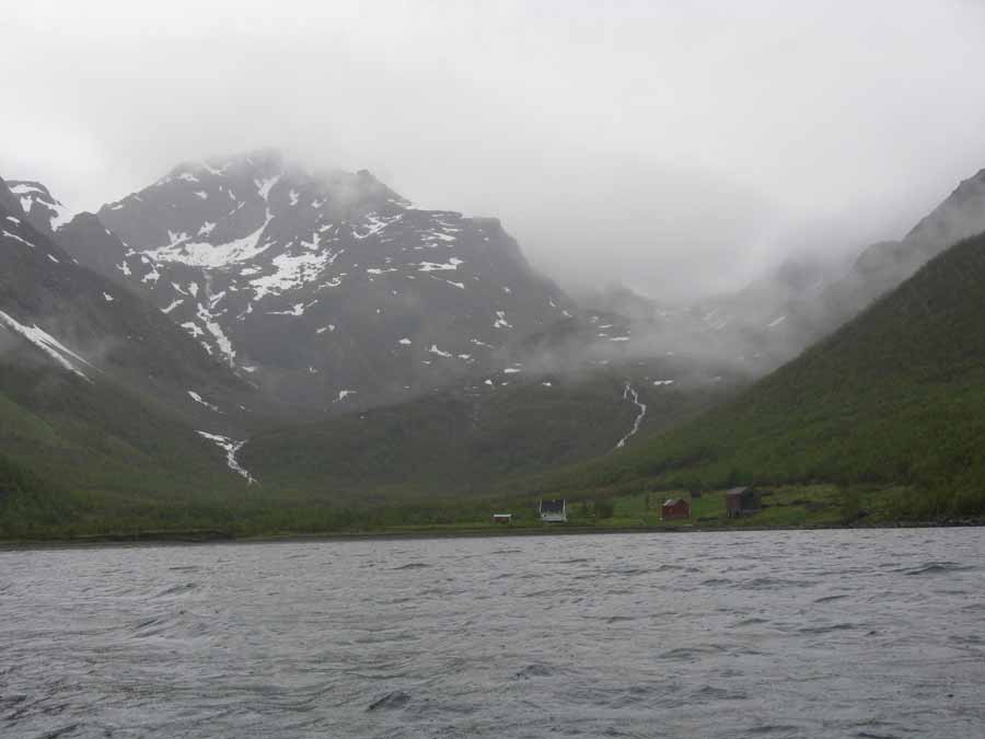 I had hoped the wind would be behind me for the final 12 km down Nordre Bergsfjord to the village of Bergsfjord, but it was against me. There was also the odd rain shower so the 1000 metre mountains were obscured. Across the fjord was the dark, lonely and mysterious island of Silda, which I am sure, had no permanent settlement.