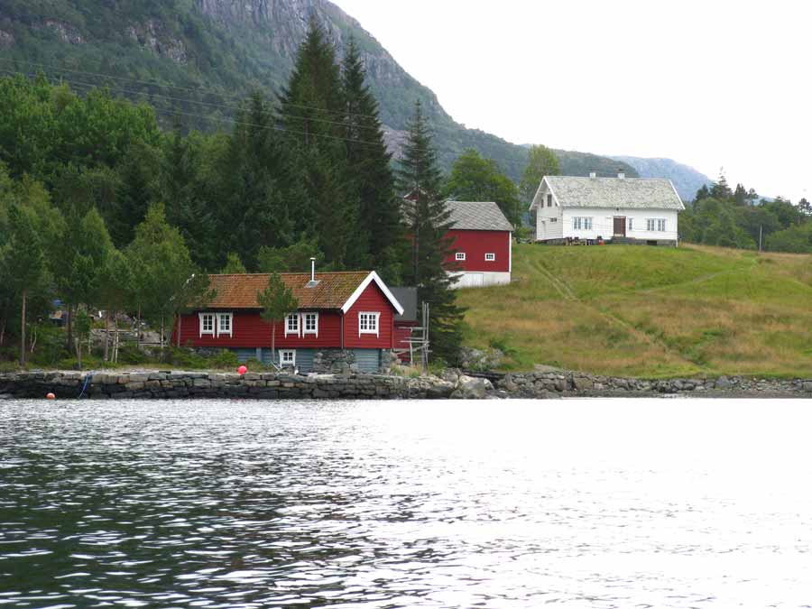 Day 215.2 In contrast to Botane Husefest was a forested lush place just 4 km down the coastWith progress slow I stopped early for lunch and a stretch at Husefest. Here there was a small hamlet and a shallow inlet. The fields were not cut and the tall grass was rippling in the wind but the houses and boat sheds were well maintained. The inlet was full of the very yellow seaweed which contrasted well with the emerald green pine forest.