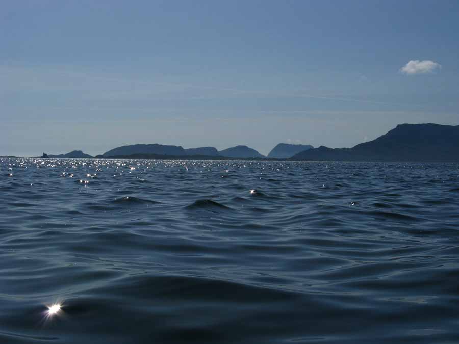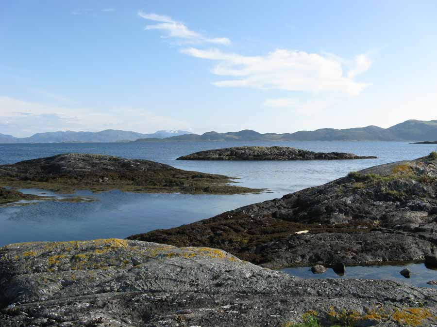The shoreline here was rock and grass with a few birch trees but as I paddled past the bay of Botane pines became more and more frequent until the whole shoreline was a thick pine forest. It was very green in the sun. While on the west side was the island of Hovden with its out-of-sight bird colony and numerous other islands all the way down to Alden with the distinctive Norske Hesten mountain on it. I felt like I was back in Helgelandskyst.