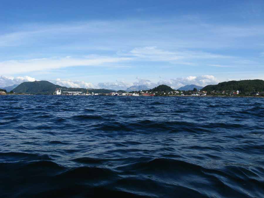 Day 215.3 Looking out from Husefest to some of the islands to the west of FloroI now had a small fjord to cross to reach Florø. It was only about 3 km but Florø was a town of about 10000 and with the outlying islands there was a lot of boat traffic. I crossed without any boats or ships coming near me. Florø looked quite a pleasant place with a great location. There was a huge shipbuilding shed at the east end of town and another factory on the tip of the peninsula in the west. The islands, both near and far made up for this industry.