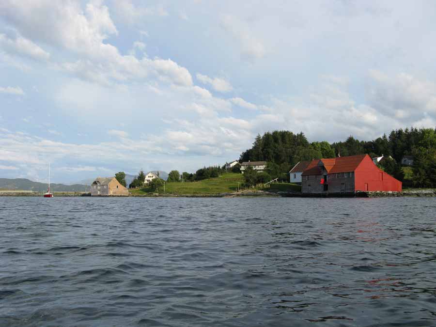 Day 215.7 The bay to the west of the folding bridge between Askrova and Tansoy islands  contained alot of cultural artifacts and buildingsI got to the south end and started looking for somewhere to camp. I paddled through the sound between Askrova and Tansoy which was a charming area. There were old fish wharfs and boathouses, a country shop, many older houses in green fields full of sheep and a bridge to connect the islands which could be lowered and raised to let sailing boats past.