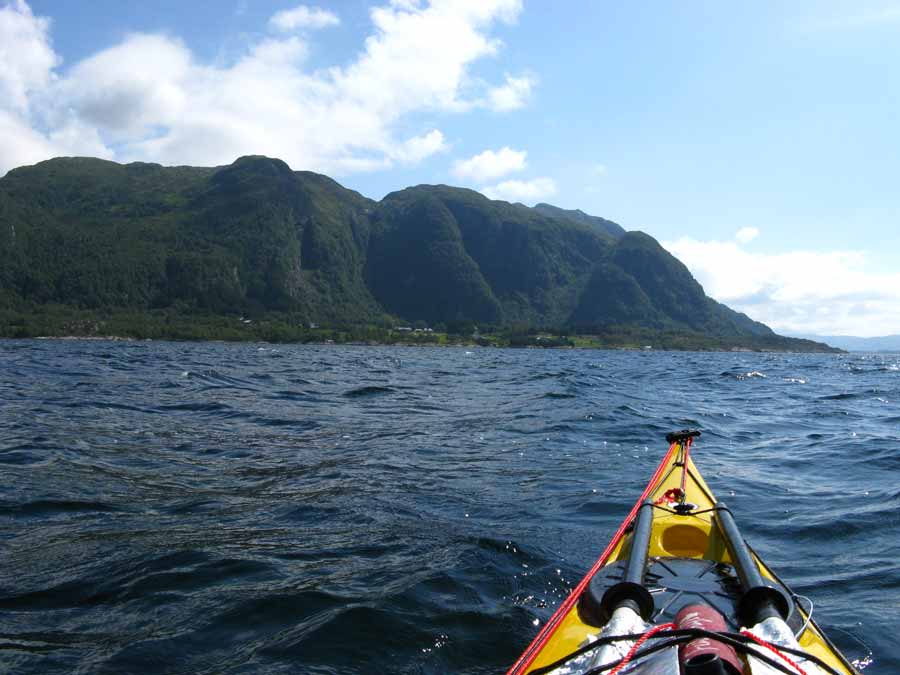 It was a beautiful still morning as I started to head across Stavfjord. It was the outer part of the long and deep Fordefjord which cut inland for some 50 km. As a consequence there was a bit of a tide flowing into the fjord which I noticed.