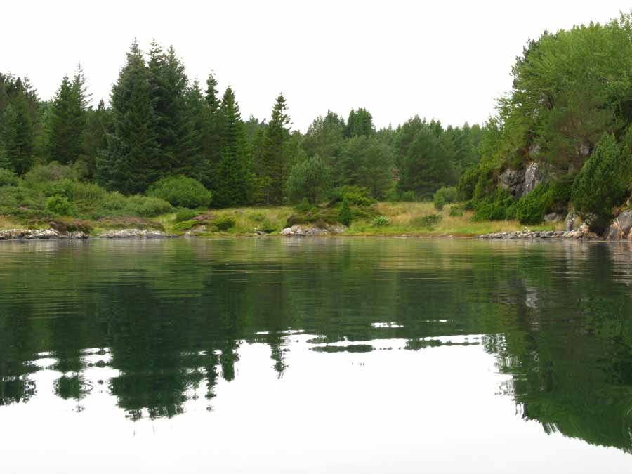 It eventually spilled me into the basin of Lurefjord which was another land altogether. This had the feel of an inland lake. It was only the jelly fish and seaweed which gave it away. There were masses of small islands covered in tall spruce and pine and the undergrowth was thick with willow and rowan.