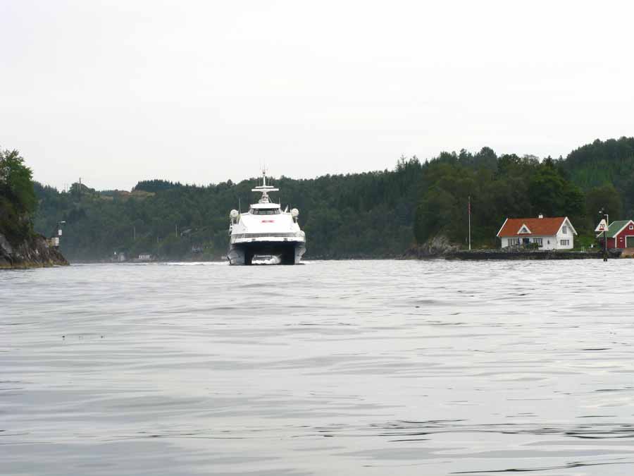 Day 219.3 Radsund was a busy trtoughfare for boat traffice heading north of BergenRadsund was anything but deserted. It was like going straight from a farm track onto a motorway. The whole sound was buzzing with cabin cruisers mostly heading northwards. It was Friday late afternoon and everybody would be heading up to their cabins on the islands in the basin of Lurefjord. There was a constant wash. Then suddenly from around a corner appeared not one but two of the large high speed express boats. There was a speed limit here otherwise crashes would have been inevitable.