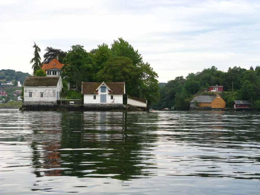 Day 219.4 One of the islands in Radsund near Alverstraum which were adoened in lavish houses and exotic gardensAt Alverstraumen there were some more islands again and some were formed into nice gardens with a lavish older house among more exotic deciduous trees like copper beech. There were many other houses along the bank with all manner of boatsheds from decorative wooden ones to large old corrugated sheds with a mess of broken moss covered boats beside along the damp bank.