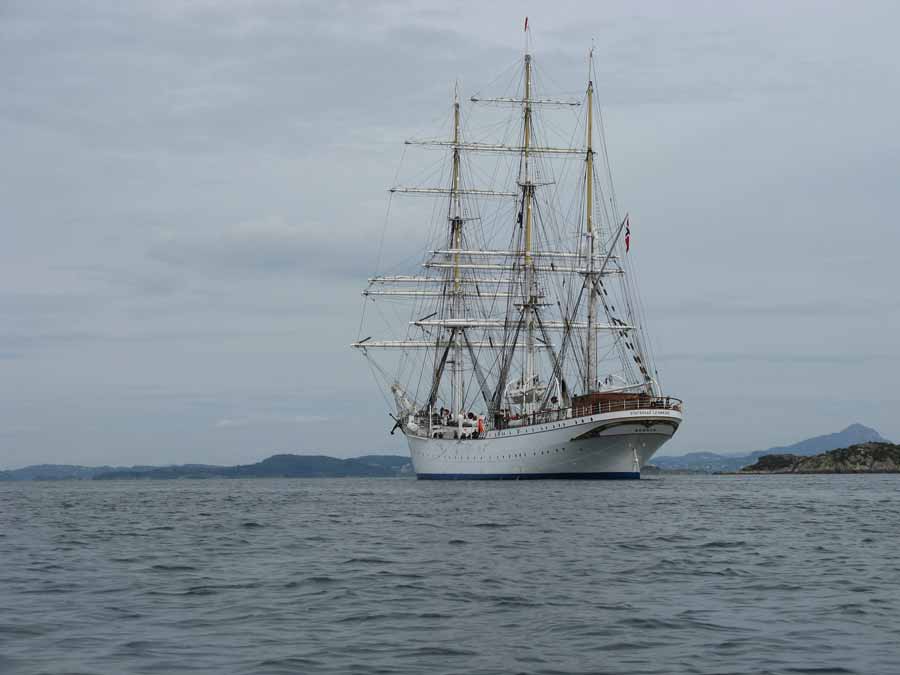 I crossed Raunefjord to the small island of Leroy where there was a salmon farm. I seem to be passing about 4-5 large salmon farms a day at the moment. I would guess that there are well over 1000 in Norway all together each with an average of 6 large cages. As I reached the narrow section between Leroy island and Sund town a fantastic sight came round the corner and the tedium was relieved. It was the Statsraad Lehmkuhl.