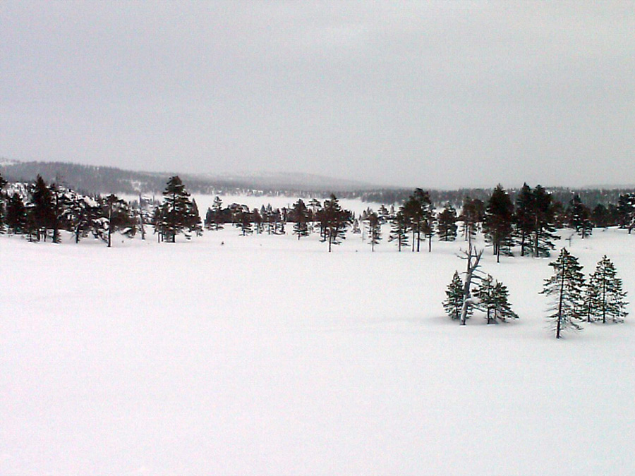 The trail rose over a crest and I got my first glimpse of Veressjoen lake some 4 km to the north. From here the stakes descended through the magnificent pine trees, many with spiralled trunks which comes with age. Just as the final descent to the lake began I came across some very fresh snow scooter tracks. The dident follow the stakes but descended to the lake anyway. I followed them