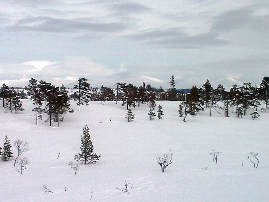 I slowly climbed out of the trees entirely onto a very broad ridge with a couple of lakes gouged into it. From here I got a marvellous view north across forests to large rounded mountains in the distance. These mountains stretched across the northern horizon and must have been about 1250 metres high. They were the Skjaekerfjella mountains and extended across the border with Sweden, where there were a National Park. With high the rounded mountains and extensive pine forests one could be forgiven for comparing it to the more rugged parts of the Scottish Highlands.