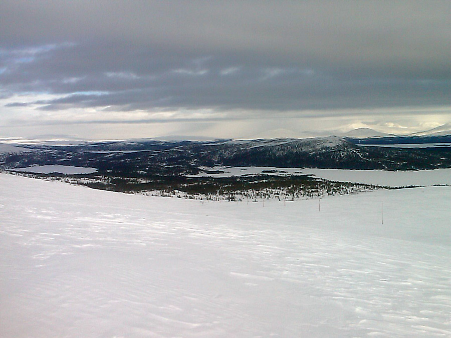 As I climbed the views got better, especially behind me of the Skjaekerfjella mountains I passed through yesterday. I first got a good view when I was about half way on Nordskardklumpan, a small mountain. Here stretching some 30 km was the white Torron lake with a wide fringe of dark forest around it stretching far into Sweden.