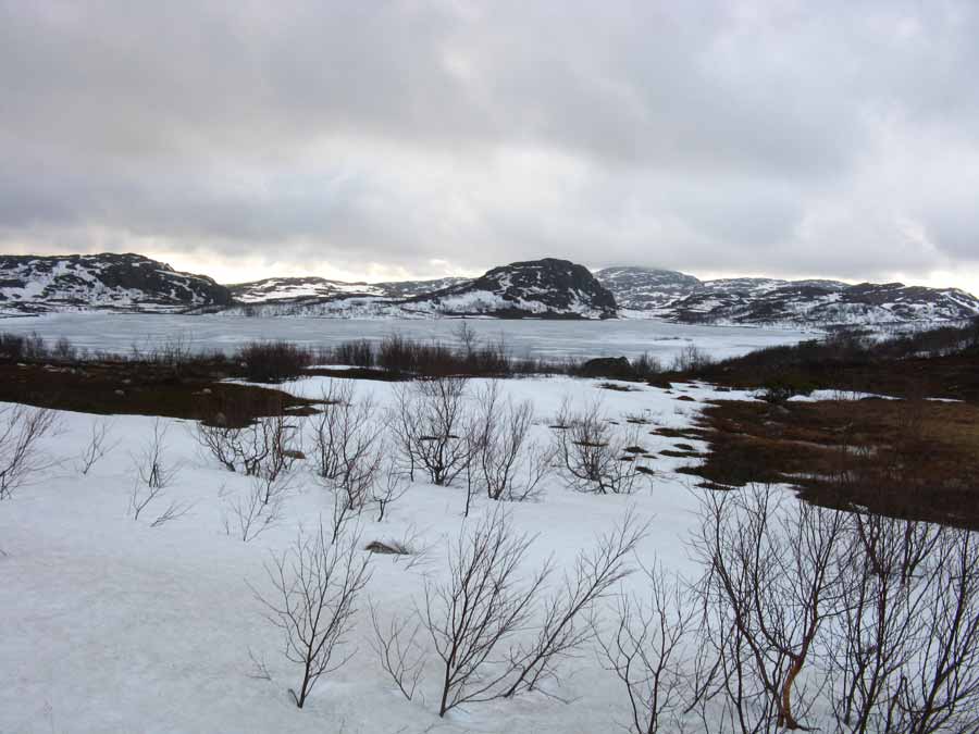 Then I started up a long climb up to the Jarfjordfjellet Mountains. Here the road climbed to almost 200 metres. It was a different world up here. The lakes were still ice covered and the hillsides still had considerable snow on them. The drifts at the side of the road were a few metres high. This section of road is blocked in the winter. Just before the top an army jeep stopped and a chirpy young soldier hopped out with a bike. It was in perfect working order. He took the knackered bike.