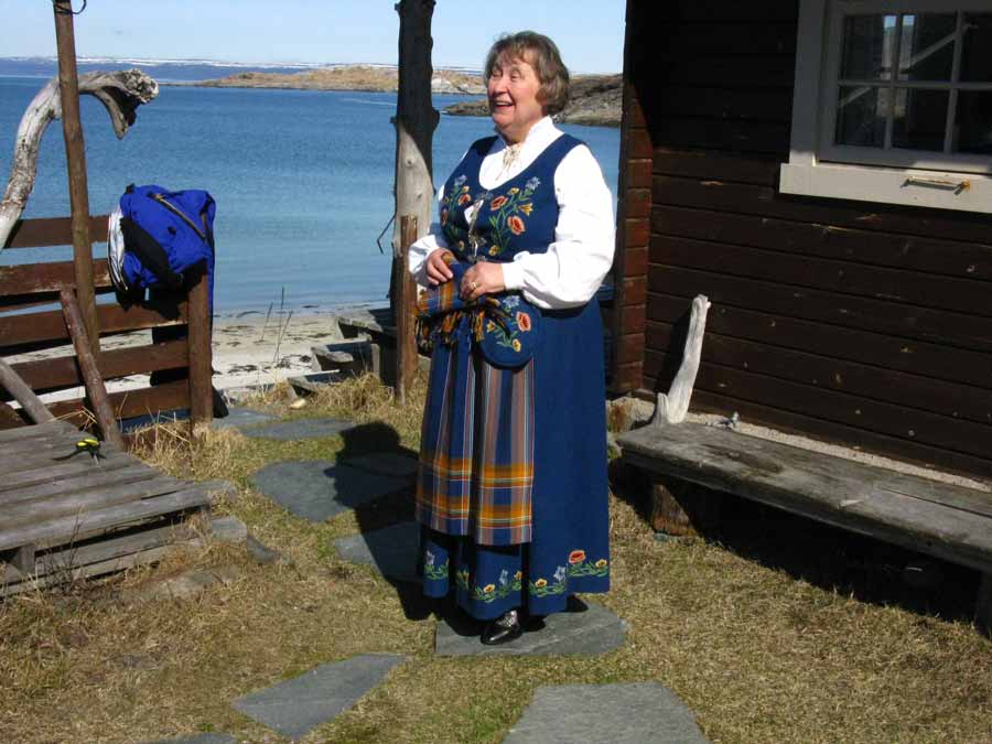 day-1371-our-host-in-bugoynes-in-the-traditional-nordlands-bunad-ready-to-celebrate-17-mayI did not get to sleep until 0100 last night due to writing. It was difficult to keep track of time as it was light all night. So this morning I did not get up until 0830. It was an absolutely stunning morning with a reasonably calm sea lapping at the golden sands below, blue skies and a warm bright sun. It is east to see how this place can attract tourists in the summer.