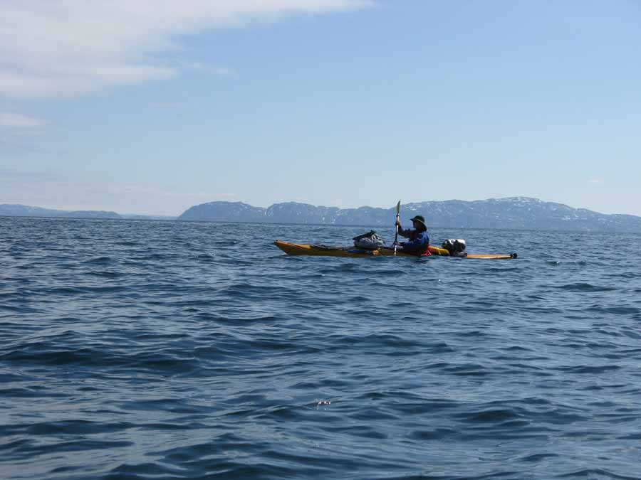 day-1372-crossing-the-varangerfjord-to-vadsoOur 17th of May was going to be on the water. I was going to paddle with Jon today across the fjord and up the coast towards Vardo. We were ready to go at 1130. I was horrified at how much stuff Jon had. There was way too much to go in the boat so he had 3 bags on the deck. It was not possible to paddle the approaching Osthavet, Nordishavet and Lopphavet coasts with such baggage. The wind and waves would blow one off course and rip it off. Today though there was no such problem and it was peaceful, quiet and sunny day.