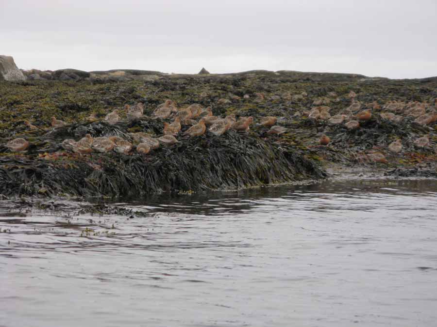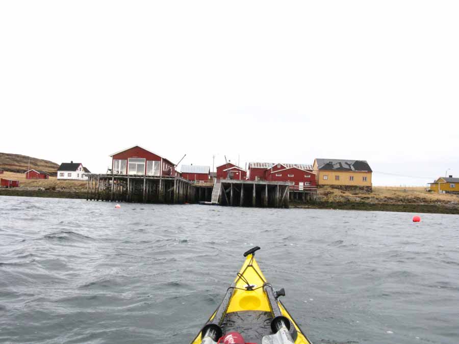 day-1374-possibly-a-flock-of-purple-sandpipers-searching-in-the-intertidal-zoneI passed numerous small coastal hamlets, all had brightly coloured wooden houses and were surrounded by bleached sheds and small racks for drying fish. Most had a small beach or bay but no real jetty so launching days would have been limited for fishermen here. As I paddle close to the coast I saw a large flock of Purple Sandpipers (I think) and various groups of smaller waders which I assume were Stints. Otherwise birdlife was quite poor.