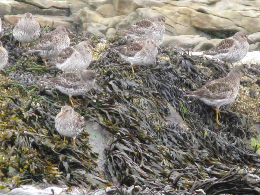 We paddled into the wind under the cliffs with all these birds quietly observing them. There was a lot of courting and mating going on and many squabbles. At the east end of the Ekkeroy, which is connected to the mainland by a sandy isthmus with a road, was a sea eagle. It flew off as soon as it saw me. There were also numerous small sandpiper type of birds which I think are Stints along the shore pecking in the wet seaweed
