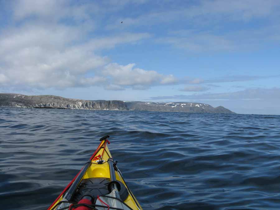 Sandfjord was quite a narrow fjord with steep cliffs on each side. Its’ end was some 7-8 km to the south and it was likely to be a large sandy beach judging by the terrain and name. However there would be very large surf to get through before one could land here and this would no doubt test my rolling skills. Indeed there was probably nowhere to land until the days’ revised destination of Mehamn. I had by this stage given up the idea of rounding Kinnarodden in this sea because if I got the tide here wrong the waves would be dangerous, especially if the wind increased as forecast.