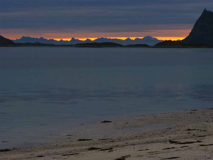 As I was going about my tasks at 0330 there was perhaps the best skyscape I have seen on this trip. The sky was dark except for a bright orange strip which silhouetted the saw like profile of the mountains on the Lofoten island of Austvagoya.