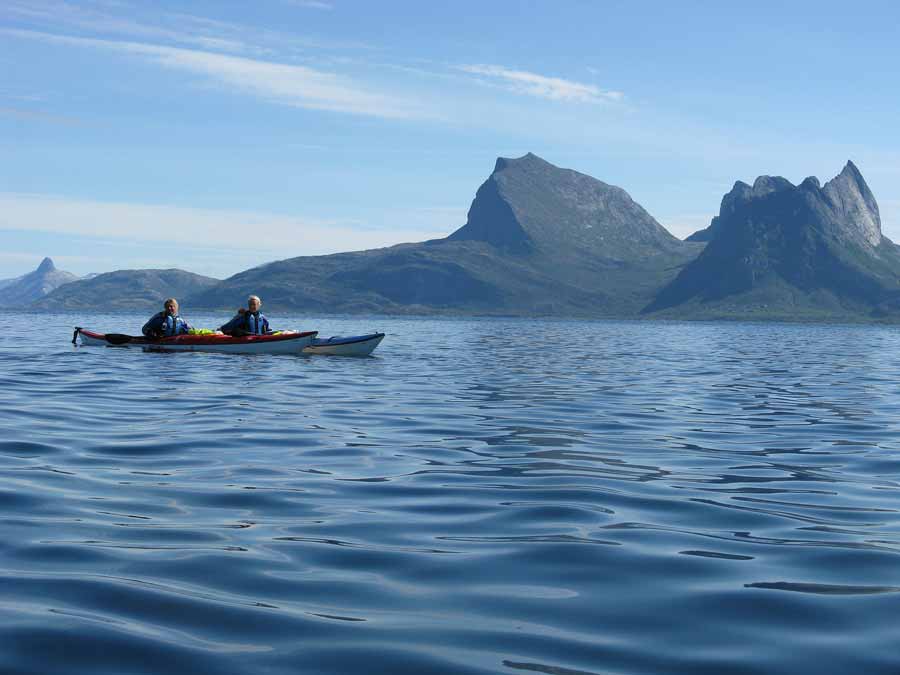 We hopped from island to island with the sun getting higher and warmer. We shot past Helloya and paddled over to Karlsoy. I took a few photos here, most notably of the claw like Eidetind, 1020m, with its massive and vertical south face and fell behind, but the girls waited occasionally and we paddled on chatting.