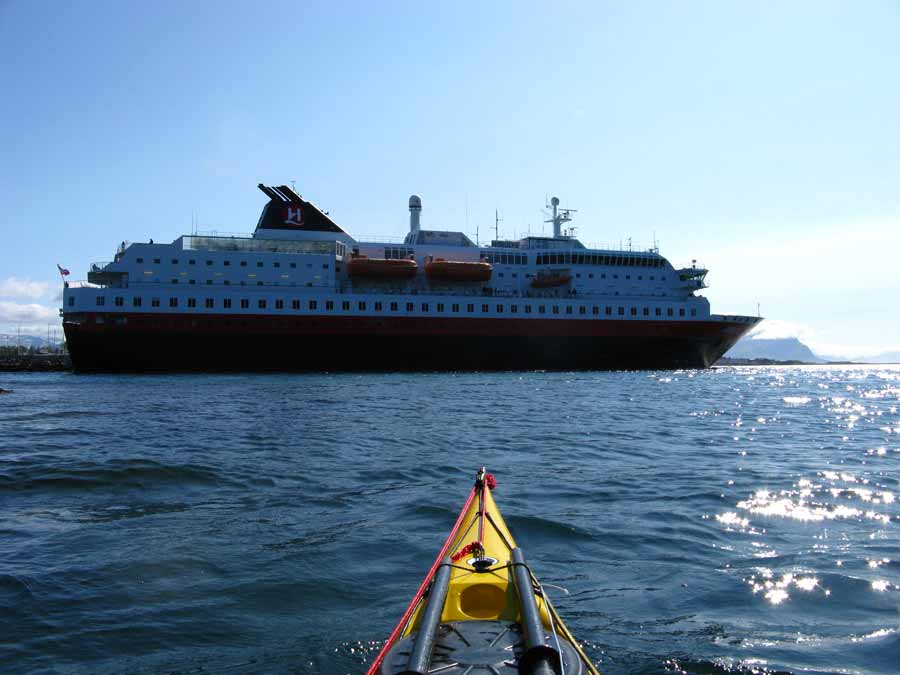 I was about to cross the harbour mouth when the Hurtigruten ferry streamed out. It was one of 13 boats which take 11 days to do the Bergen-Kirkenes-Bergen run with a northbound and southbound ferry passing each of the 25 odd ports each day. Today’s ferry was the Nordlys. The one I had a near encounter with at Berlevag some 5 weeks ago. I wonder if it recognized me.