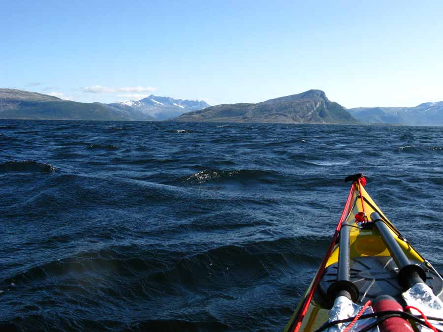 As I entered the sound of Landegofjorden between Landgode island and the mainland the wind increased up to a force six. It was still behind me and I was getting blown along at a tremendous rate sometimes. The waves tented to slow me down as although I could surf down the occasional one I was also sliding down the back of the wave passing under me into the trough. The waves where going at least twice the speed I was. This resulted in a wallowing motion of stopping and starting. If I caught a good surf wave I was doing 12 km an hour for a burst.