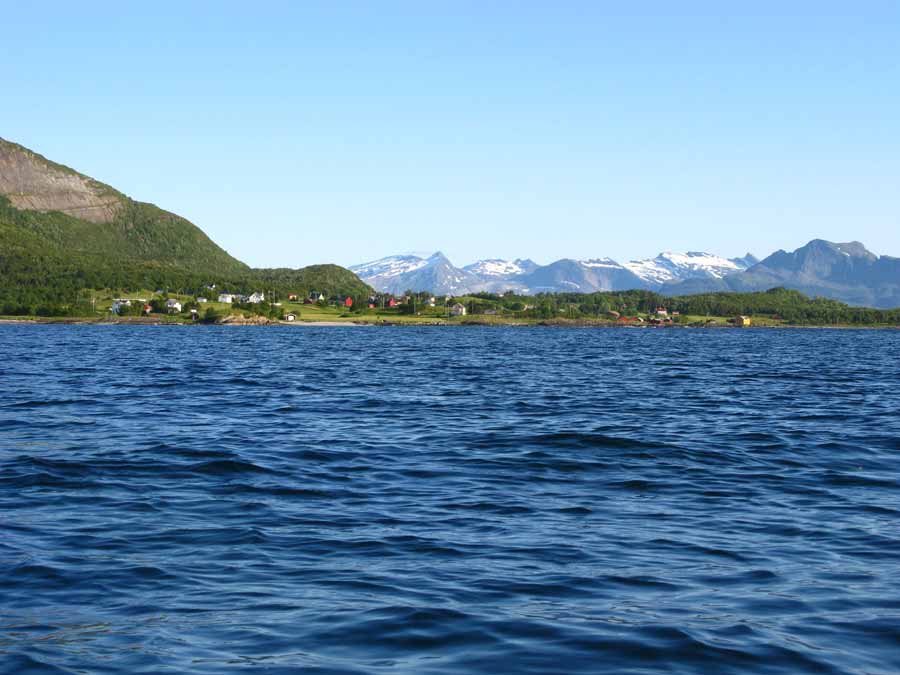 I paddled right past the whole of Bodo and was thinking to go round the peninsula and up Saltfjord to camp at an official campsite near the shore. It was a bit too risky to cross the open 10 km Saltfjord in this force six wind. However as I came to the tip of the peninsula I noticed that the wind had dropped off to a force four and that the sea was more protected. I stopped among some islets, ate a late lunch and considered the options. The girls had reached Bodo at 0900 and called it a day here and were lucky with a campsite in the main harbour area.