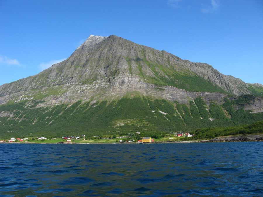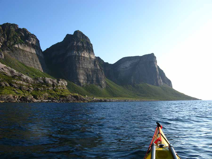 I continued down the west side of Femris towards some very spectacular mountains along the edge of the coast here. Some of them rose steeply up for 1000 metres and there were many immense buttresses which almost gave an escarpment appearance. I paddled in the tranquil weather along their base having to lift my head back to see the tops. The slopes at the base of these cliffs were covered in birch forest before the rock rose up vertically. Unusually, much of the geological strata was horizontal. This was not because it was undisturbed, as this coast has seen violent geological forces at work twisting huge areas, but because of coincidence that these forces left them horizontal after twisting, crushing, stretching and bending them.